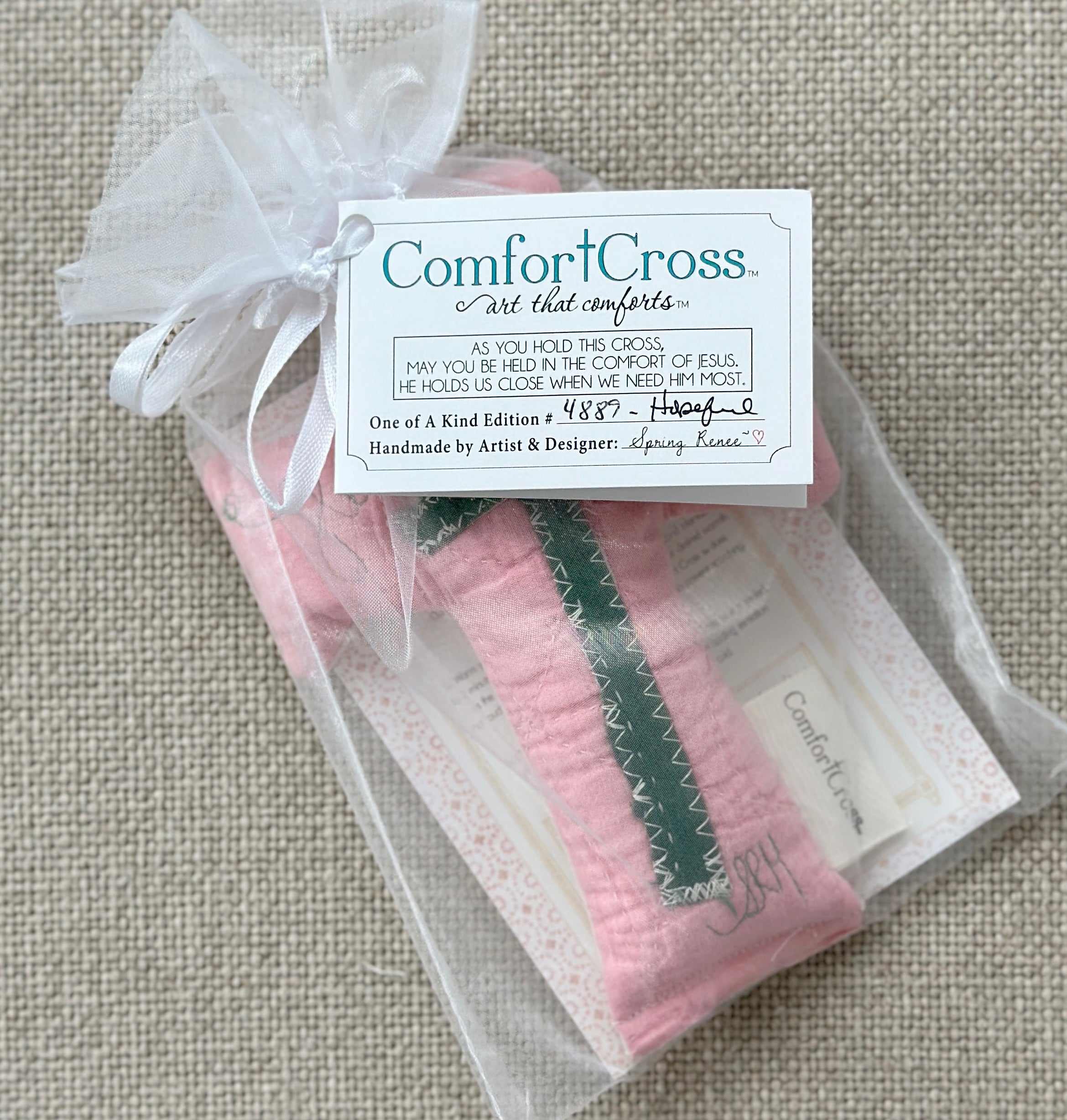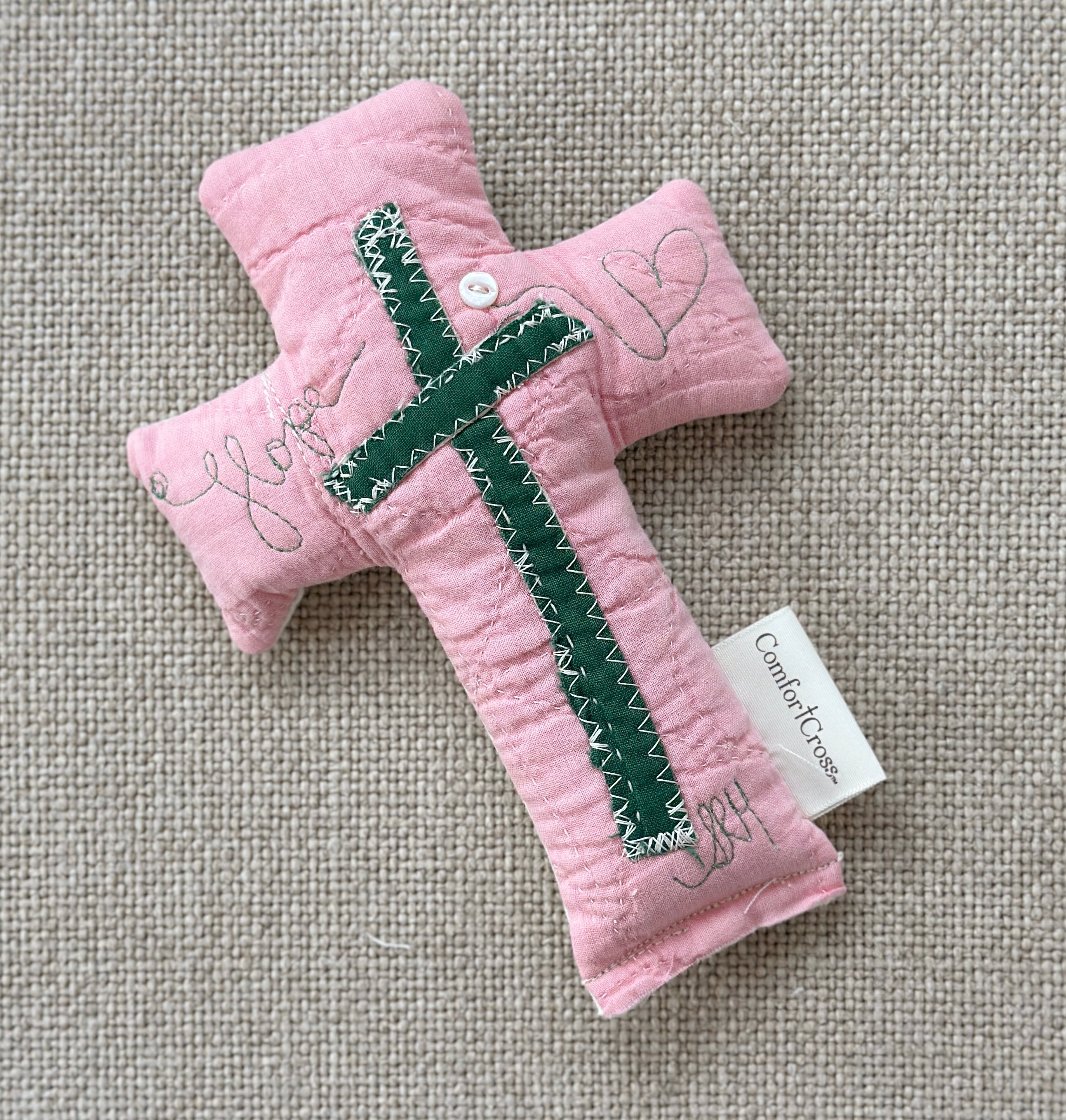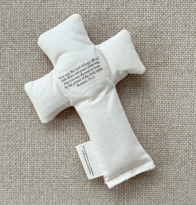 Our Comfort Crosses from Spring Renee are soft, weighted hand-made crosses that fit perfectly in your hand.  Each cross is prayerfully sewn by Spring and her staff, combining new, vintage, and antique textiles.  Each one is a unique design with words of love and encouragement stitched onto them.  The weight of the cross is a perfect reminder of the Lord's presence with you as you hold it in your hand, and the words serve as a reminder of all that we know is true.