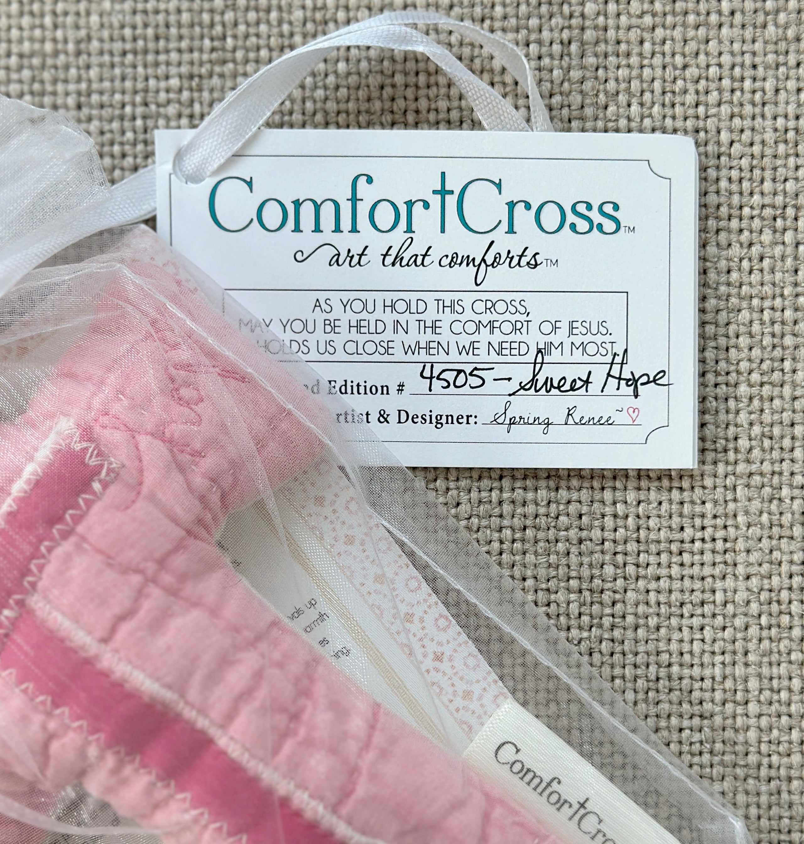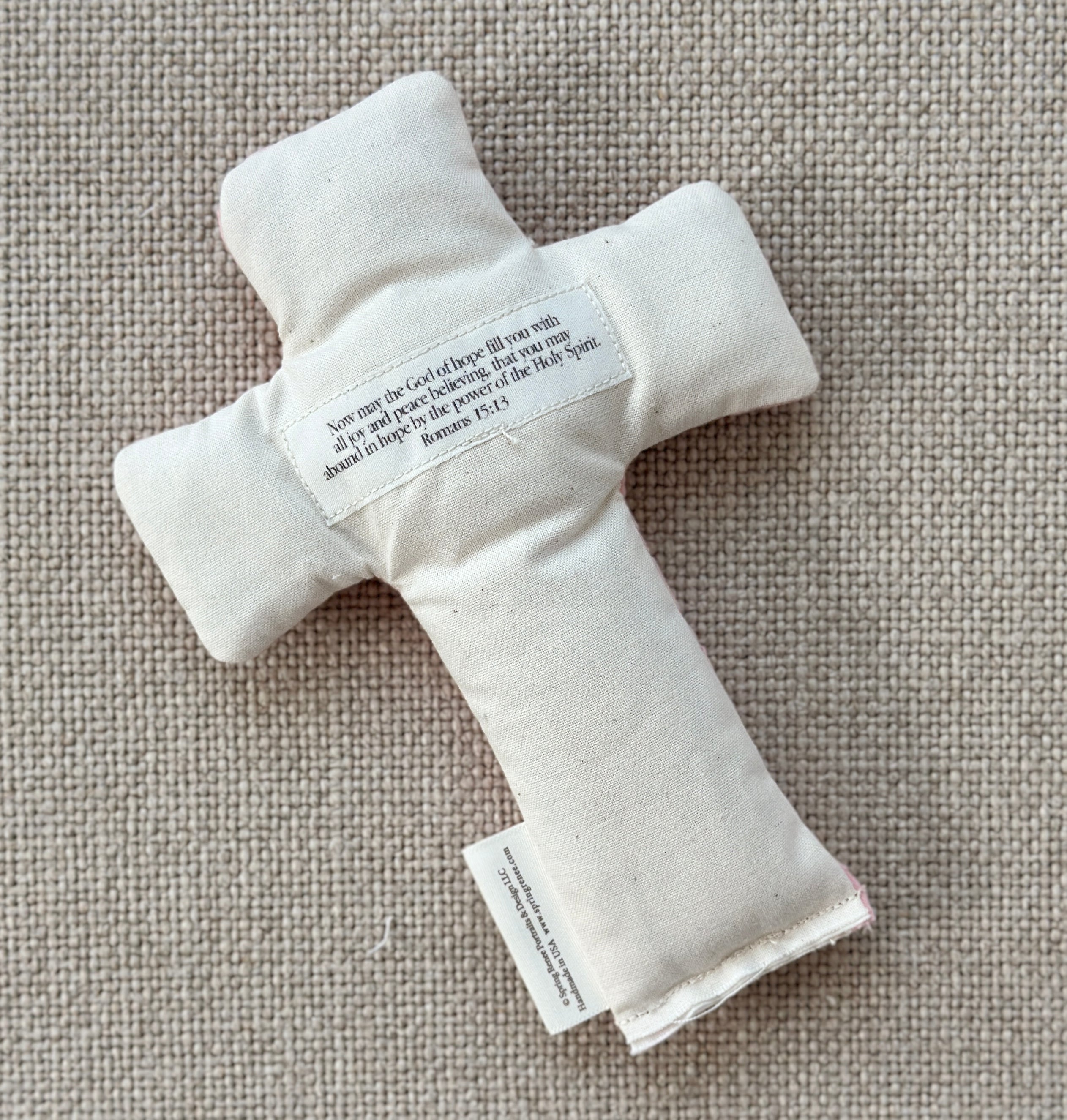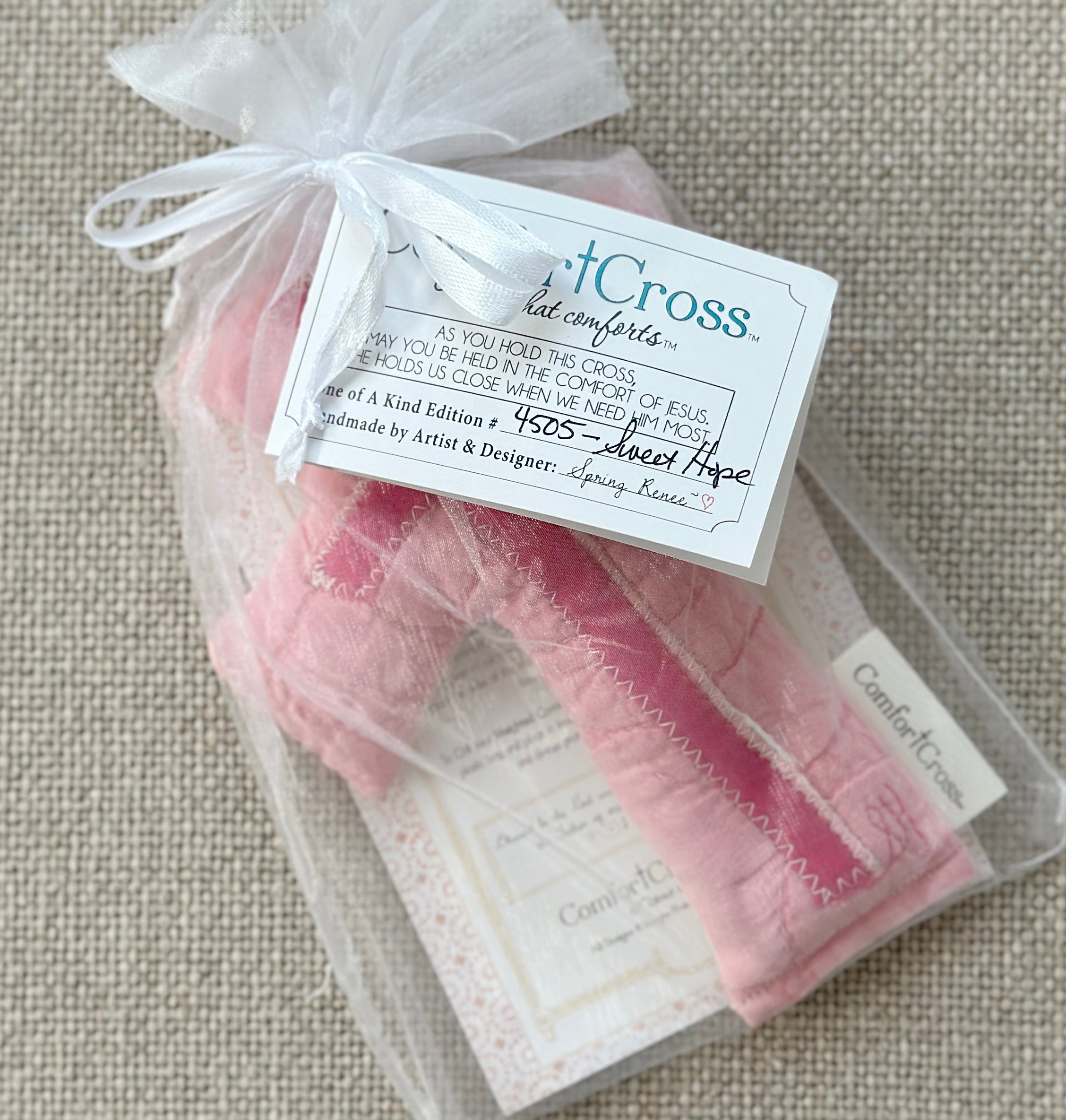 Our Comfort Crosses from Spring Renee are soft, weighted hand-made crosses that fit perfectly in your hand. Each cross is prayerfully sewn by Spring and her staff, combining new, vintage, and antique textiles. Each one is a unique design with words of love and encouragement stitched onto them. The weight of the cross is a perfect reminder of the Lord's presence with you as you hold it in your hand, and the words serve as a reminder of all that we know is true.